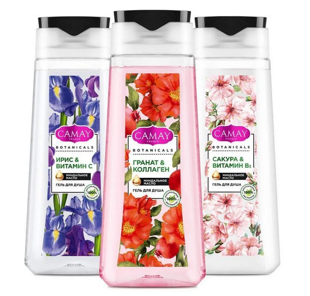 Гели для душа «Цветы граната», «Благоухающий ирис», «Японская сакура» Botanicals, Camay