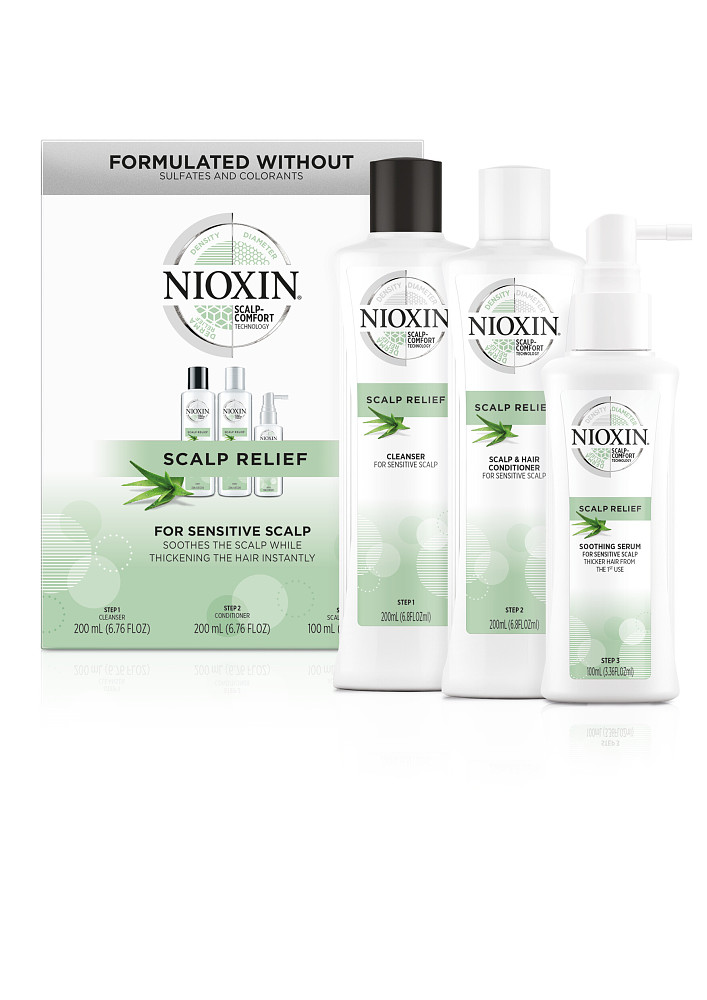 3-ступенчатая система Scalp Relief – это комплексный уход за кожей головы и волосами, который успокаивает и увлажняет, поддерживает ее естественный баланс и утолщает волосы с первого применения. Система Nioxin Scalp Relief для ухода за чувствительной кожи головы способствует утолщению волос и включает в себя: эффективный щадящий очищающий шампунь, кондиционер для кожи головы и волос, успокаивающую сыворотку - несмываемое средство.