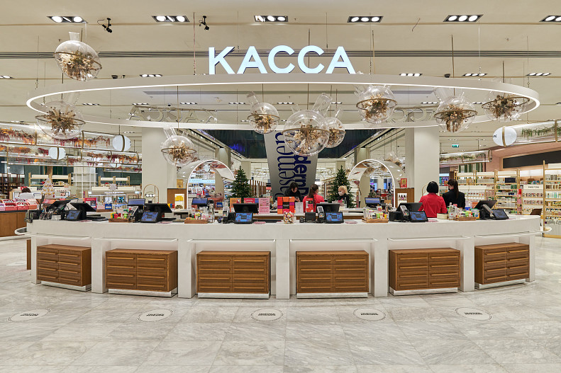 Новая концепция, прежде всего, отразилась на интерьере магазина, созданного в сотрудничестве с известным архитектурным бюро Пергаева: мрамор, дерево, высокие потолки, натуральные материалы и комфортная планировка – все это придает обновленному РИВ ГОШ уникальный экологичный облик.