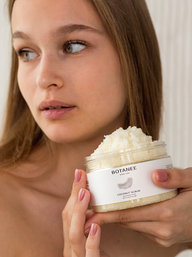 Отшелушивание ороговевших клеток происходит бережно благодаря мягкому абразиву морской соли и кокосовой стружки. Помимо них, в состав входит целый комплекс натуральных масел, которые в свою очередь глубоко напитывают кожу и не забивают поры: масло жожоба, масло ши, масло органы и масло какао. Насыщенный маслянистый состав скраба не требует дополнительного увлажнения кожи кремом после его использования.