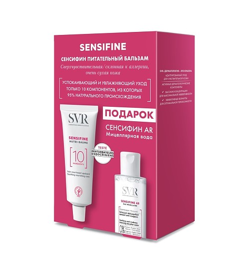 В набор входит питательный бальзам Sensifine NutriBaume и мицеллярная вода SVR Sensifine AR Eau Micellaire. Бальзам восстанавливает естественную гидролипидную пленку эпидермиса для защиты кожи от внешних агрессивных факторов благодаря маслу ши и пантенолу в составе. Мицеллярная вода сохраняет гидролипидную мантию и физиологический уровень рН эпидермиса.