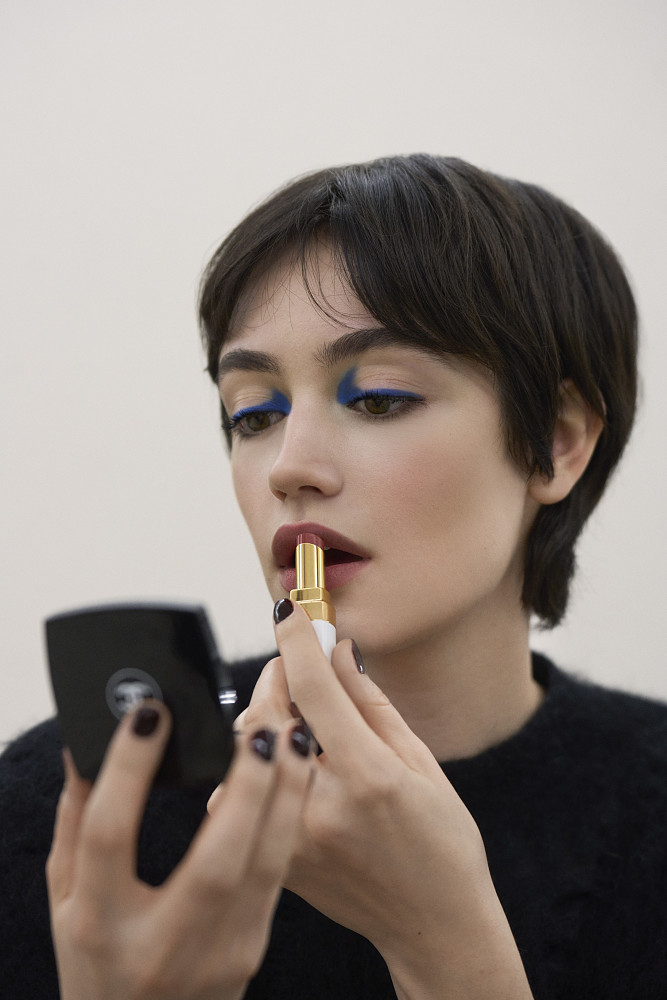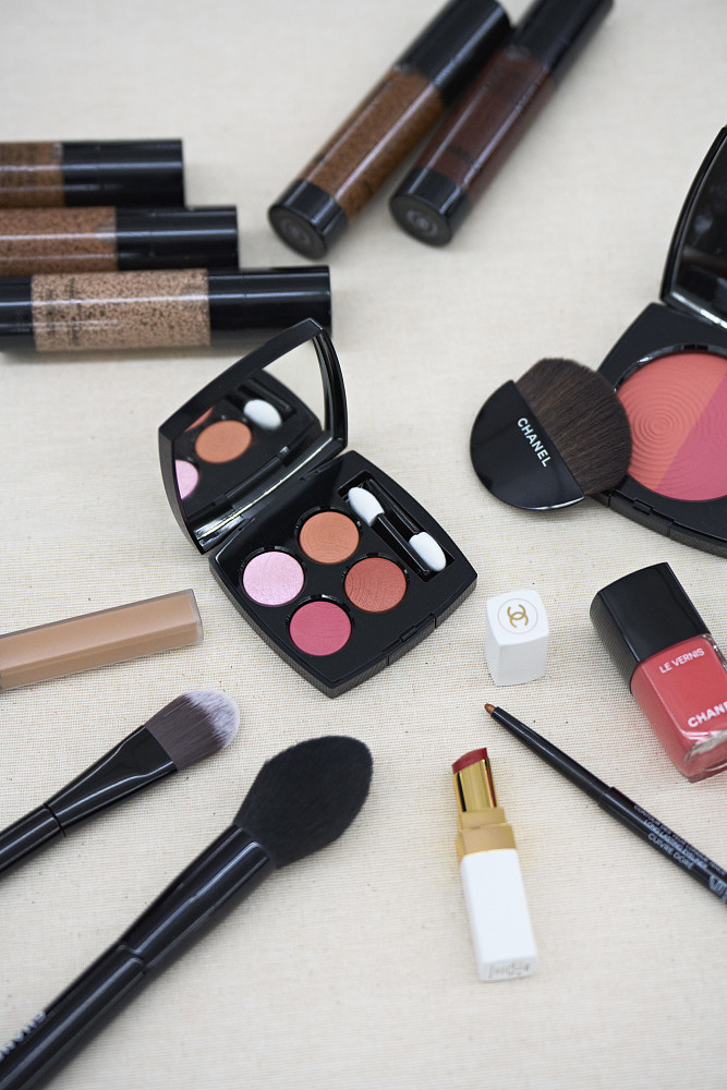При создании макияжа были использованы: флюид-тинт Les Beiges Water-Fresh Complexion Touch, корректор Le Correcteur De Chanel, румяна Exclusive Creation Roses Coquillage и другие средства.