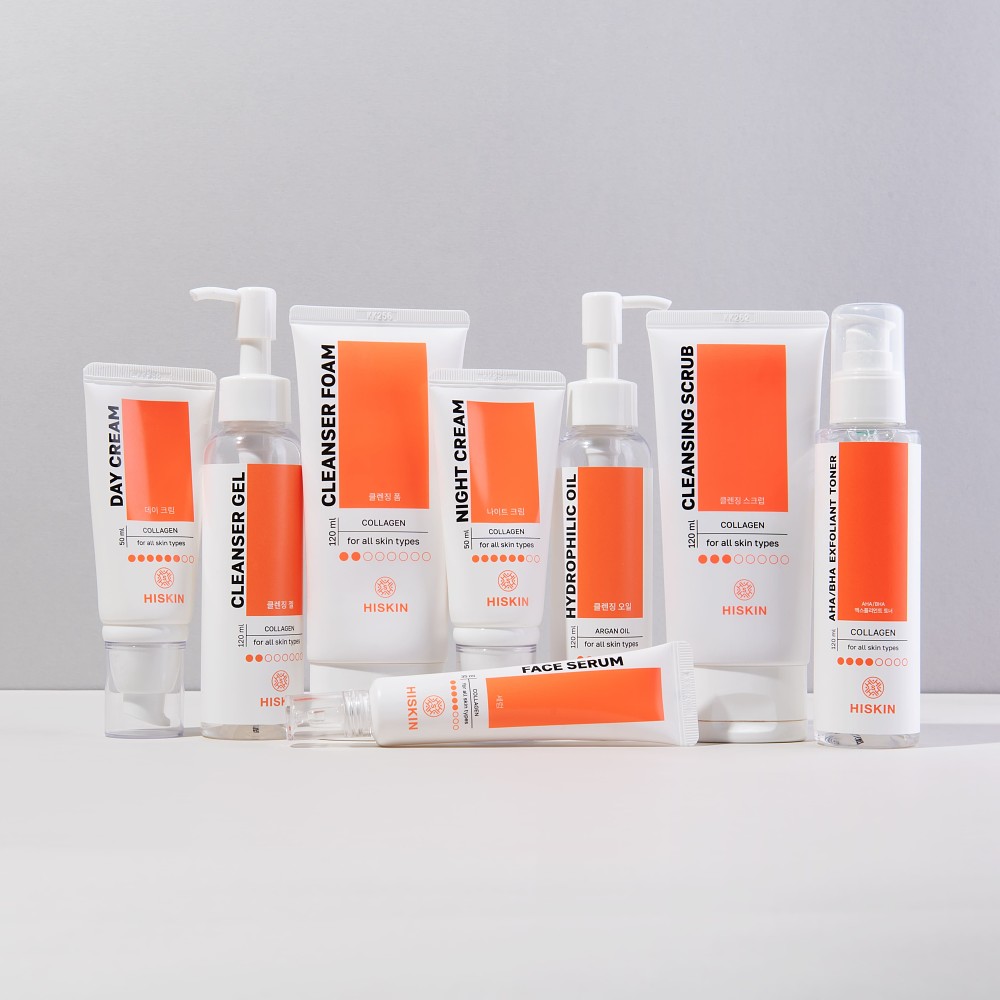 Благодаря высокому содержанию жирных кислот гидрофильное масло арганы повышает упругость и эластичность кожи. Ключевую функцию в составе пенки для умывания HISKIN выполняет натуральный белок коллаген. Скраб для умывания и AHA/BHA эксфолиант-тонер бережно и эффективно очищают поры, восстанавливают упругость и эластичность. Коллаген, морские водоросли и минералы, входящие в состав сыворотки, дневного и ночного крема глубоко питают и защищают кожу.