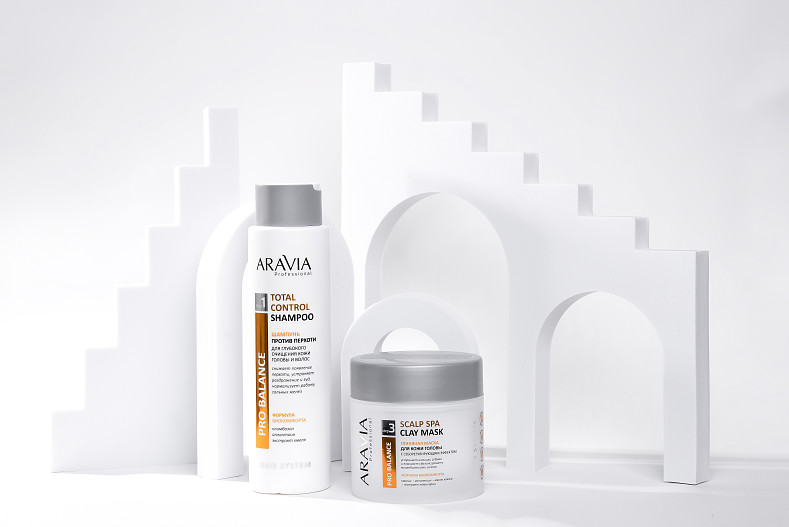 Шампунь против перхоти для глубокого очищения кожи головы и волос Total Control Shampoo и глиняная маска для кожи головы с себорегулирующим эффектом Scalp SPA Clay Mask, Aravia Professional