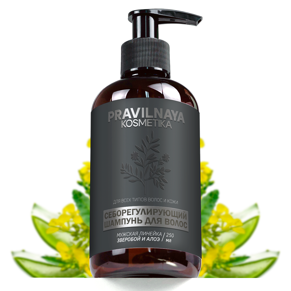 Мужской питательный себорегулирующий шампунь для волос от перхоти и зуда, Зверобой & Алоэ, Pravilnaya Kosmetika станет эффективным средством для поддержания здоровья и стиля ваших волос.