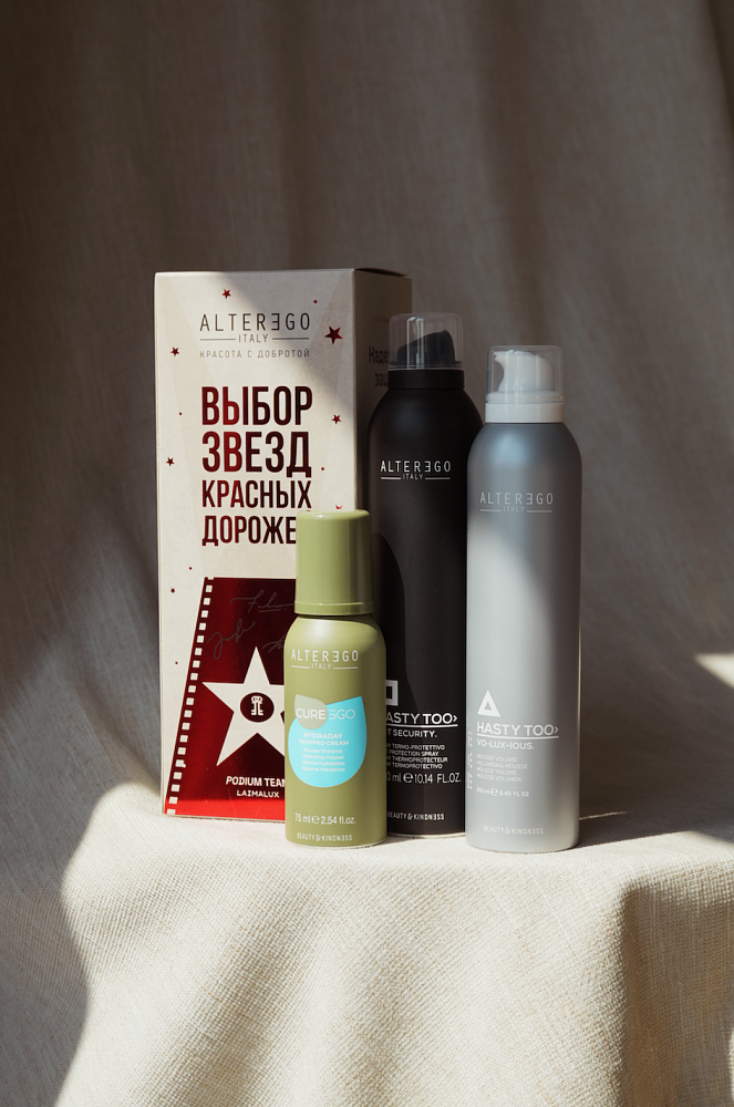 AlterEgo Italy выступает официальным стилистом многих летних кинофестивалей, и в честь этого бренд представил лимитированный набор с топ-продуктами для укладки. В набор вошли 3 средства, которыми пользуются профессиональные стилисты при создании образов актрис на красных дорожках ведущих российских кинофестивалей. Термозащитный спрей Hi-T Security для укладки защищает волосы от воздействия горячих инструментов. Мусс для объема средней фиксации Vo-lux-ious придает мягкость и стойкий объем. Взбитые сливки для увлажнения волос Cureego Hydraday тревел-форматасмягчают волосы без утяжеления.
