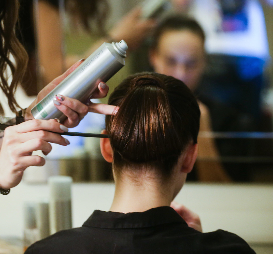 Стилист по волосам Ольга Кондратьева: «Ангелина пришла с четким пониманием того, что ей нужно, но в итоге всё вышло немного иначе. Основным пожеланием было прикрыть лоб челкой. А вот небрежный пучок решили не делать, поняли, что хвост будет смотреться гармоничнее. Волосы обработали термозащитой, выпрямили утюжком и собрали».