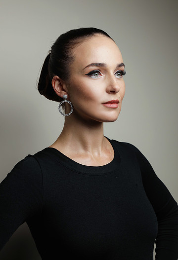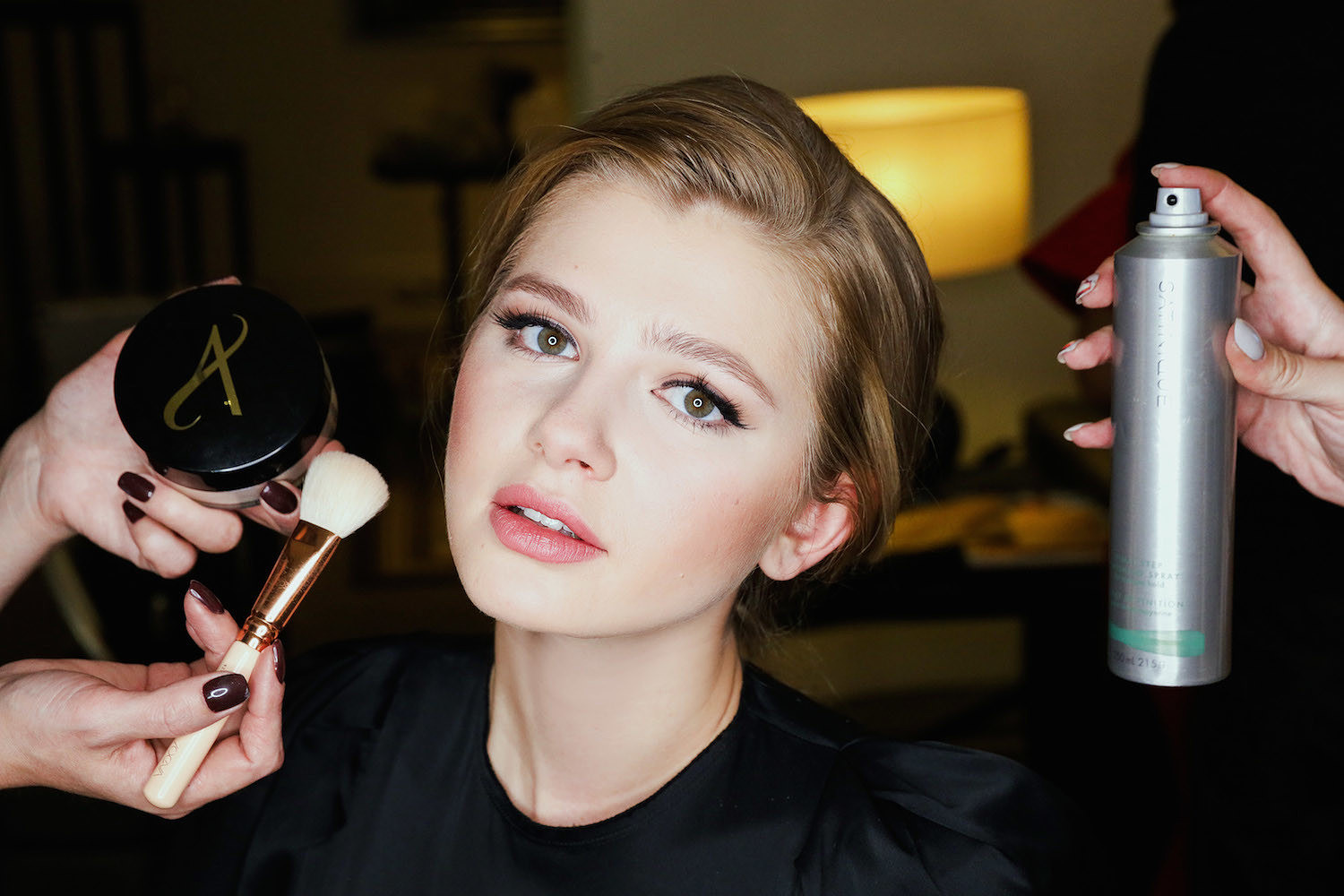«У меня было платье со сложным фасоном, поэтому решила не отвлекать от него внимание. Собрала волосы, а в макияже сделала акцент на глаза. Сегодня хочу быть строгой, хотя обычно хожу с цветными стрелками — синими, желтыми, бордовыми. Не люблю, когда блондинкам делают черные Smoky eyes, — теряется изюминка. Хайлайтер тоже не ношу, он добавляет ненужный блеск. Всегда выбираю матовый тон, корректор и румяна».