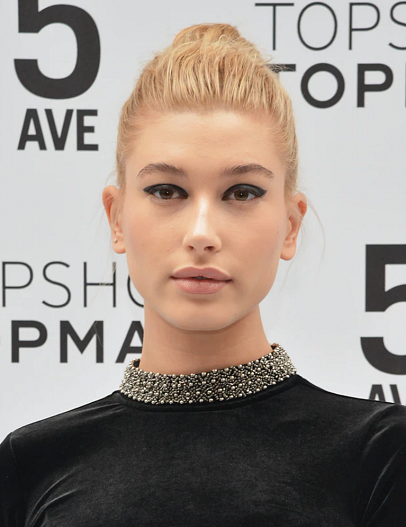 В 2014 году Хейли Бибер начала проводить смелые эксперименты с макияжем. Например, черные толстые стрелки на все веко, которые сильно контрастировали с нюдовой помадой.