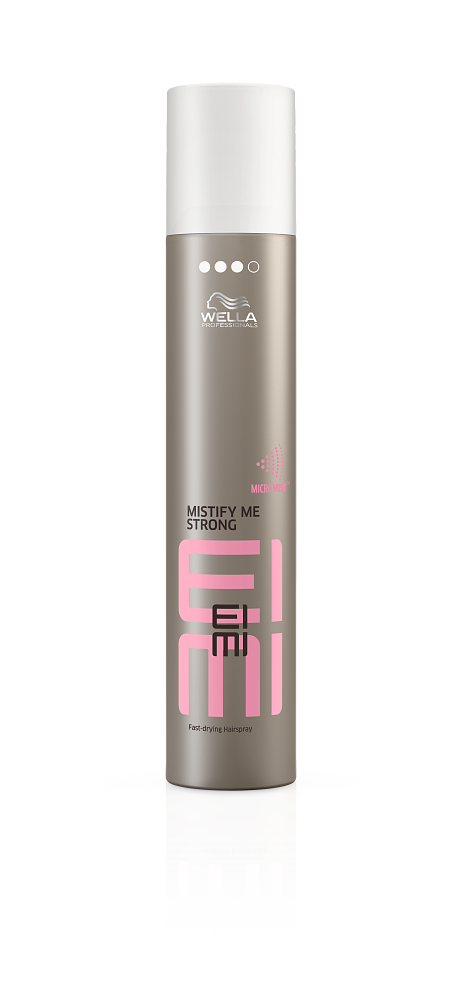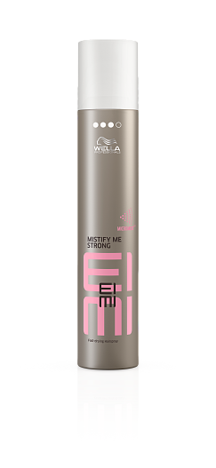 3. Расчесываем локоны, сохраняя направление от лица и задавая прикорневой объем. Наносим сухой лак для волос Mistify Me Strong EIMI от Wella Professionals для безупречной фиксации.