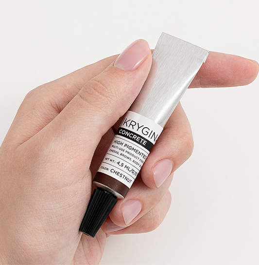 Образ легко воссоздать с помощью нюдовой гаммы кремового пигмента Concrete: подойдут оттенки Chestnut, Beige, Peach. Подчеркните контур глаз и губ красно-коричневым Chestnut, добавьте к нему Beige и этот микс нанесите на центр губ. Большой пушистой кистью создайте активный персиковый румянец на щечках, остатки продукта «снимите» на веки, подбородок, боковые поверхности лба. Пальцем вбейте теплый персиковый Peach в губы.