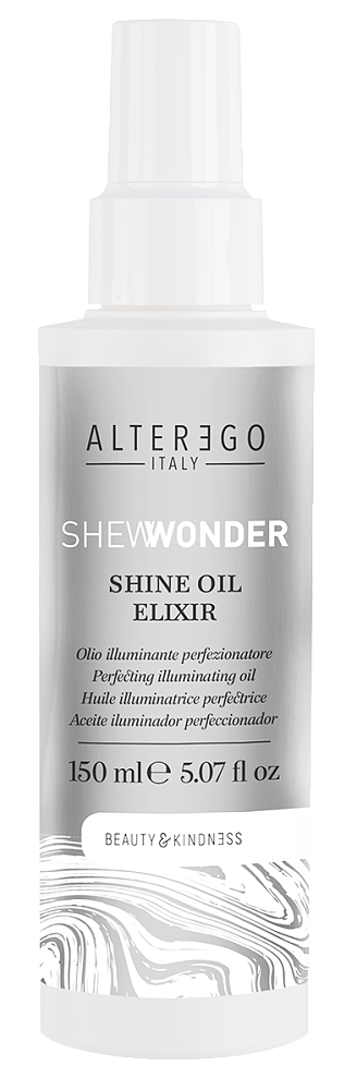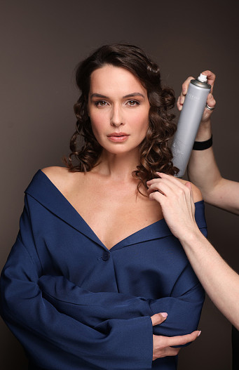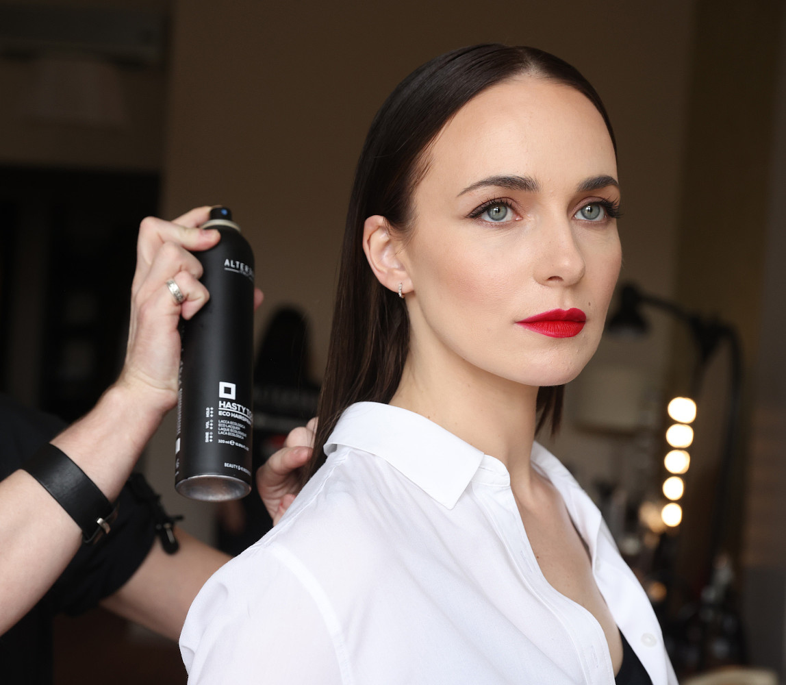 Для создания модной гладкой текстуры сначала проработали прикорневую зону сухим шампунем. Перед использованием горячих инструментом распылили термозащитный спрей Hi-T Security от AlterEgo Italy. Далее выпрямили волосы с помощью стайлера Infinity, HH Simonsen и зафиксировали эко-спреем сильной фиксации который не только обеспечит стойкость укладки, но и защитит волосы от влаги. Чтобы придать волосам дополнительный глянцевый блеск, нанесли масло-эликсир Shine Oil Elixir от AlterEgo Italy.