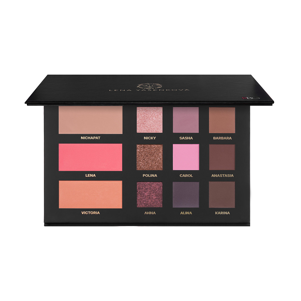 Создали вечерний образ с акцентом на глаза. В качестве тонального средства большой пушистой кистью нанесли минеральную пудру. Затем выполнили коррекцию лица, на яблочки щек нанесли нежно-розовый оттенок румян и золотистый хайлайтер из «Литературной палетки». Перед тем, как начать макияж глаз межресничное пространство прокрасили черным гелевым карандашом. Затем нанесли глубокие коричневатые оттенки теней из палетки «Lena Yasenkova»: оттенком «Karina» проработали впадину верхнего века и внешний уголок, оттенком «Alina» и небольшой кистью вывели стрелочку и растушевали ее. Губы решили оставить нейтральными: слегка прорисовали контур карандашом, а затем кистью нанесли тинт «Усилитель красоты».