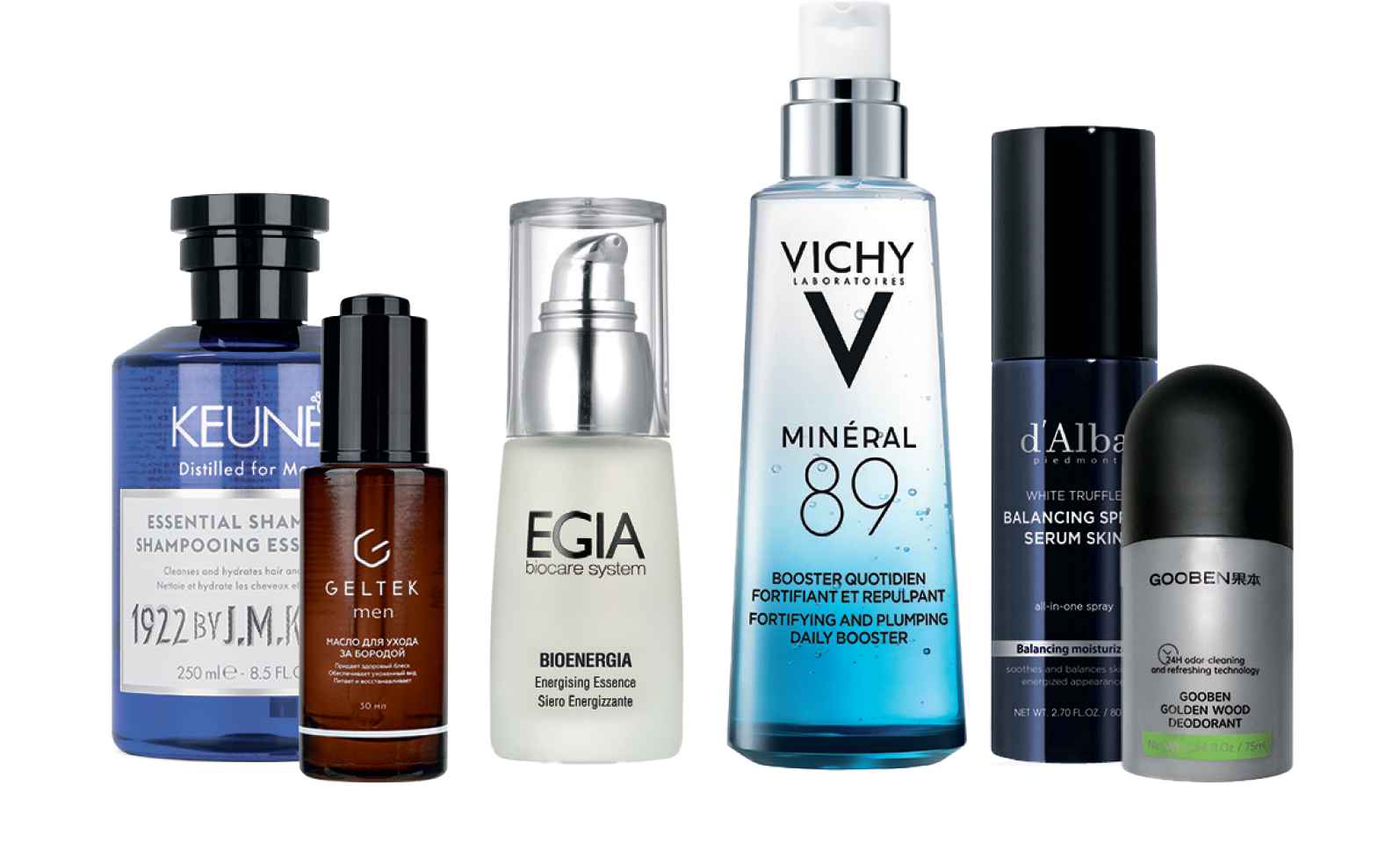 Шампунь для волос и тела 1922 Essential Shampoo, Keune. Масло для ухода за бородой Geltek Men. Сыворотка с витамином С Energising Essence, EGIA biocare system. Увлажняющая гель-сыворотка для лица Mineral 89, Vichy. Балансирующая спрей-сыворотка для лица Piedmont White Truffle Balancing Spray Serum Skin, d'Alba. Мужской роликовый дезодорант-антиперспирант GOOBEN Golden Wood.