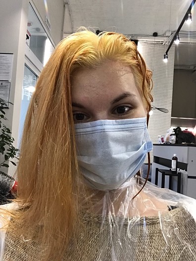 После первого окрашивания и 30-минутного ожидания, когда краситель впитается в пряди, Ирина и Валентина провели восстанавливающую процедуру для волос. Немного подсушив их полотенцем, я посмотрела в зеркало и была немного в шоке от своих желтых корней. В голове уже промелькнула мысль «и мне с этим ходить месяц?». Мастера меня успокоили и сказали, что в таком виде они меня не отпустят.