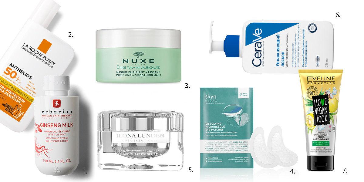 1. Питательное молочко с женьшенем, Erborian; 2. Солнцезащитное средство для лица и кожи вокруг глаз Anthelios SPF50+, La Roche-Posay; 3. Очищающая разглаживающая маска для лица Insta-Masque, Nuxe; 4. Микроигольчатые патчи, Skyn Iceland; 5. Увлажняющий крем для лица с SPF10, Ilona Lunden; 6. Увлажняющий лосьон для сухой и очень сухой кожи лица и тела, CeraVe; 7. Пенка для умывания, I Love Vegan Food, Eveline Cosmetics