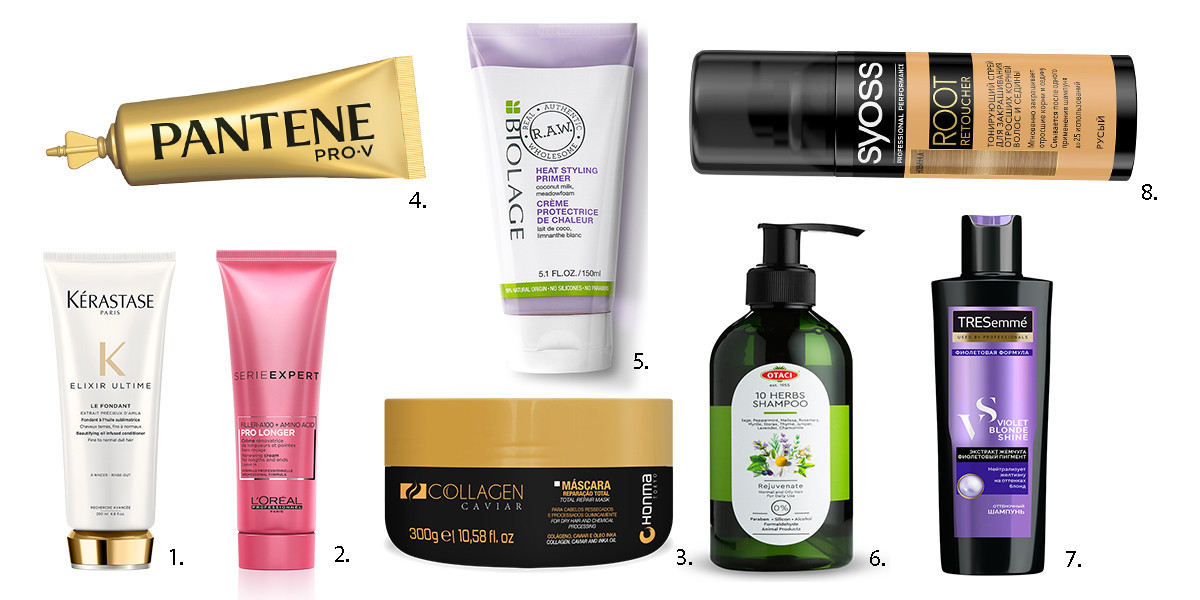 1. Молочко для волос на основе масел, Elixir Ultime, Kerastase; 2. Крем для роста волос и ухода за кончиками, Serie Expert Pro Longer, L’Oreal Professionnel; 3. Маска глубокого восстановления Collagen Caviar, Honma Tokyo; 4. Ампулы минерального коктейля для волос 1 Minute Miracle, Pantene Pro-V; 5. Праймер для окрашенных волос R.A.W. Color Care, Biolage; 6. Восстанавливающий шампунь для волос, Otaci; 7. Шампунь с оттеночным пигментом, Violet Blonde Shine, TRESemme; 8. Тонирующий спрей для закрашивания седины и отросших корней, Root Retoucher, Syoss