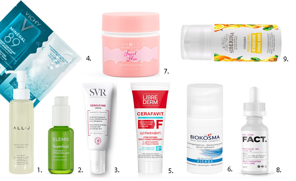 1. Масло для очищения кожи и демакияжа, ALL-J; 2. Успокаивающий гель для лица с экстрактом центеллы азиатской, Superfood, Elemis; 3. Увлажняющий и успокаивающий крем для кожи, Sensifine, SVR; 4. Экспресс-маска из микроводорослей для интенсивного увлажнения Mineral 89, Vichy; 5. Крем с церамидами и пребиотиком «Церафавит», Librederm; 6. Увлажняющая сыворотка для чувствительной кожи, Biokosma; 7. Увлажняющая маска для лица с маслом ши и экстрактом ванили Sweet Skin Ice Cream Mask, Mixit; 8. Сыворотка для лица с цинком и ниацинамидом, Fact; 9. Крем для лица «Мгновенное сияние кожи», Siberina