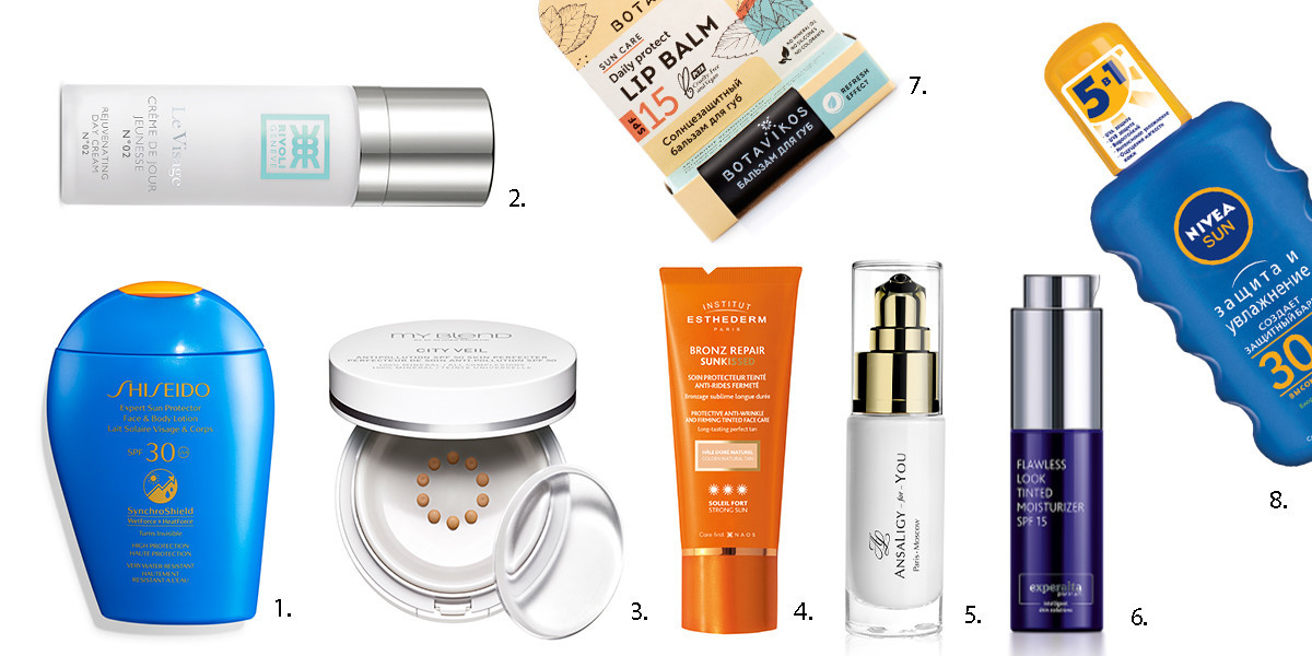 1. Лосьон для лица и тела SPF30, Expert Sun, Shiseido; 2. Крем Le Visage Crème de Jour Jeunesse N°02, Rivoli; 3. Защитный флюид-экран для лица с легким тоном SPF50, City Veil, My Blend; 4. Солнцезащитный крем с тоном с сильной защитой от солнца, Institut Esthederm; 5. Солнцезащитный крем для лица SPF30, Ansaligy; 6. Увлажняющий тонирующий крем SPF15, Experalta Platinum, Siberian Wellness; 7. Солнцезащитный бальзам для губ с SPF15, Botavikos; 8. Солнцезащитный спрей SPF30 «Защита и увлажнение», Nivea