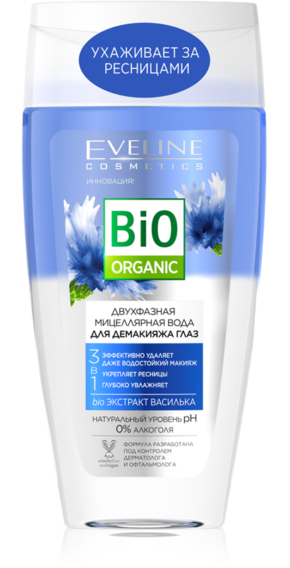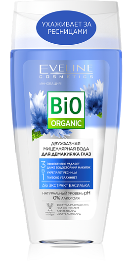 Двухфазная мицеллярная вода глаз 3 в 1 для демакияжа глаз, Bio Organic, Eveline Cosmetics