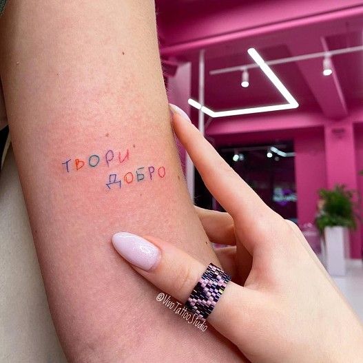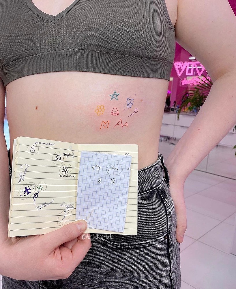 Появился тренд на осознанные татуировки со смыслом, которые дарят теплые воспоминания. Например, связанные с близкими людьми, семейные, парные татуировки. Люди делают надписи, как будто сделанные рукой бабушки или дедушки, а если их уже нет в живых, то мы находим их старые письма, иногда даже детские тетради, соединяем буквы и делаем фразы. Например, «Всегда с тобой», а также имена или прозвища, которыми бабушка или дедушка называли этого человека.