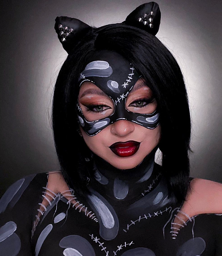 Макияж для глаз выполняйте в технике мягкой растушёванной стрелки. Здесь вам могут пригодиться кисти для растушёвки карандаша по контуру ресниц и теней по орбитальной косточке. На предварительно увлажнённые губы нанесите красную глянцевую помаду. Переходим к маске: используйте аквагрим темных оттенков или профессиональный чёрный пигмент. Нанесите белые блики и прорисуйте швы для небрежности. И не забудьте чёрный ободок с ушками.