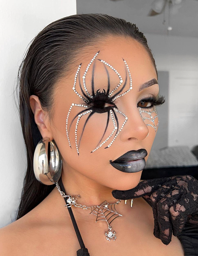 Создать образ можно с помощью стойкой тональной основы, лучше всего использовать кисть или спонж — так добьетесь необходимого ровного покрытия, черная подводка для глаз и темные тени. Точками наметьте те места, через которые должны будут проходить линии лапок, далее задекорируйте лапки стразами и не забудьте хорошо прокрасить нижнее веко чёрной подводкой. Основной элемент — брюшко паучка — разместите на подвижном веке, создав рисунок с помощью матовых угольных теней, далее нарисуйте восемь длинных, тоненьких лапок, торчащих в разные стороны. Вы можете нарисовать паука мягким, черным карандашом или жидкой подводкой, а чтобы рисунок получился объёмным и реалистичным, не забудьте добавить легкие тени и блики на лапках.