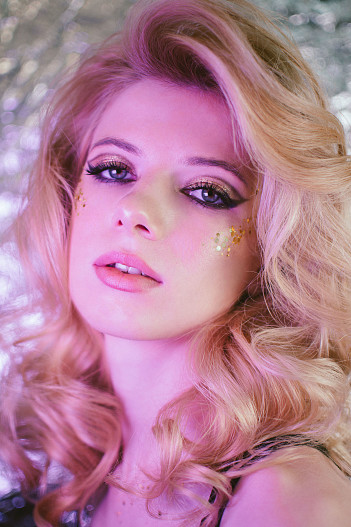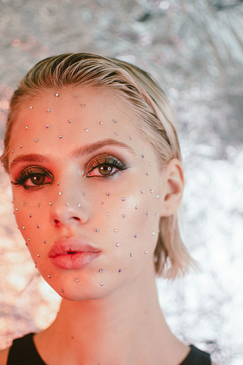 Образ модели переносит нас во времена зарождения гламура, когда блестки были повсюду, и чем больше сияния, тем лучше! Сейчас в этой эпохе нас больше всего восхищает смелая, нарочитая сексуальность и даже неприкрытая безвкусица. Прически, макияж, маникюр, одежда — все было на грани с китчем. Здесь убранные назад волосы позволяют сделать акцент на необычное украшение лица с помощью страз, передавая атмосферу закрытой вечеринки в самом модном клубе, куда можно попасть только по спискам.