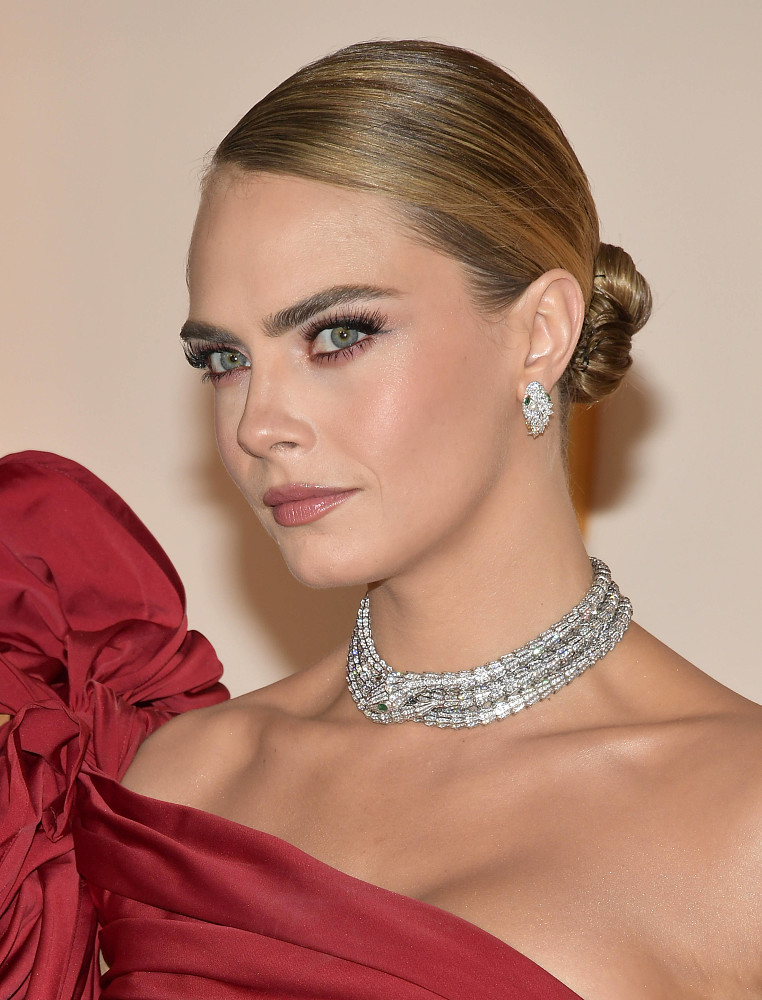 Кара Делевинь стала воплощением элегантности в бальном платье от Elie Saab. Образ завершил гладкий низкий пучок и романтичный макияж в розовых оттенках.