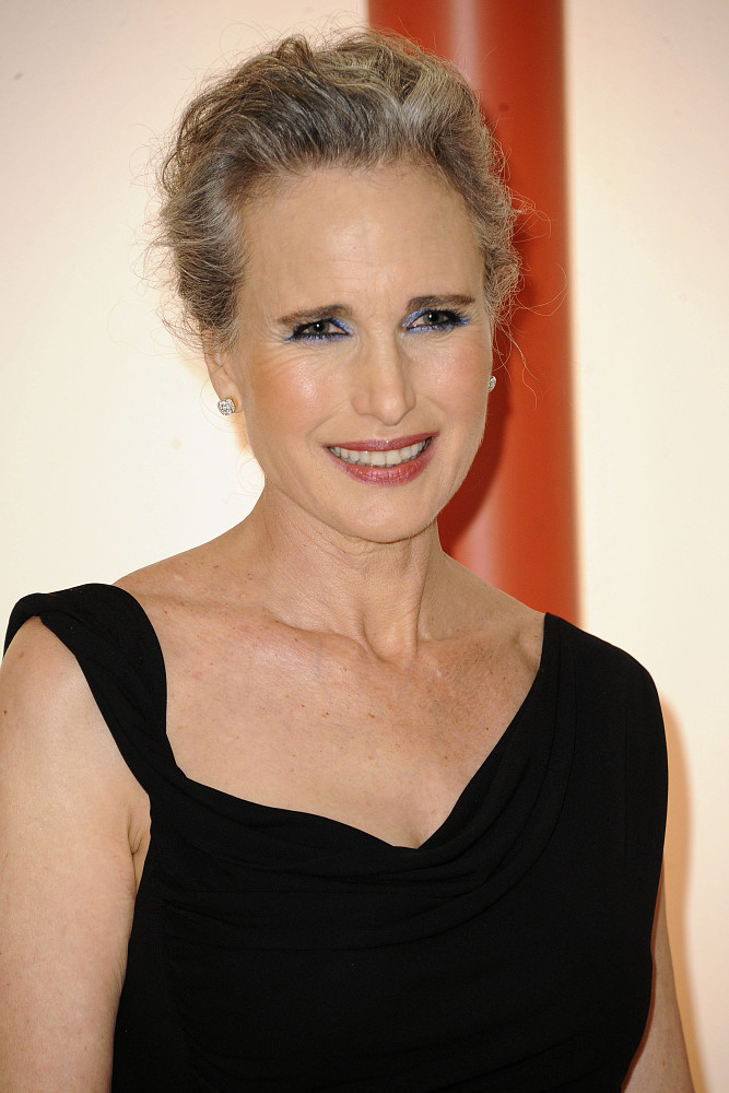 Энди Макдауэлл уложила свои кудрявые волосы в романтичную прическу с тонкими прядями, добавляющими образу немного причудливой романтики. Игривый макияж глаз со стрелками цвета индиго был дополнен розовой помадой.