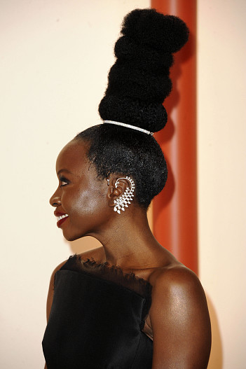 Высокая прическа Данай Гуриры потрясла всех. Укладка звезды «Черной пантеры: Ваканда навеки» — своеобразная ода африканской женской красоте. В образе актрисы сочетаются две классики макияжа: смоки айс и красные губы.