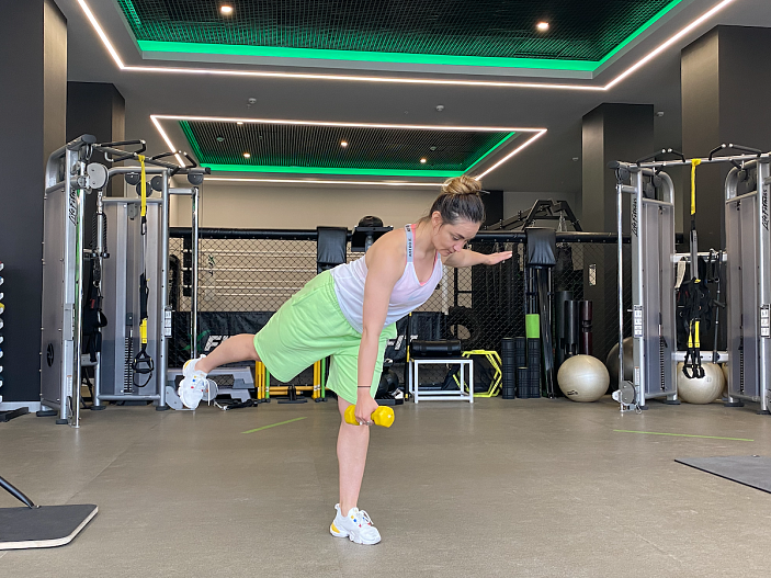 Исходное положение: стоя, вес в правой руке, опора на левой ноге. Наклонитесь прямой спиной, уводя левую ногу назад. Вернитесь в исходное положение. Старайтесь сохранять баланс на правой ноге и не ставить на пол левую.
