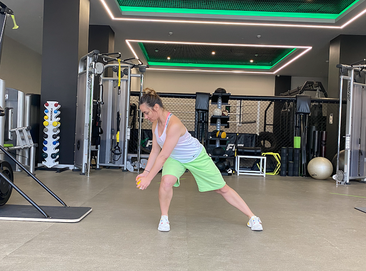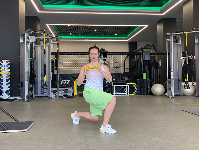 Исходное положение: стоя, вес в руках. Сделайте шаг в сторону, опуститесь в боковой выпад (следите за коленом согнутой ноги, оно должно быть направлено четко вперед, стопы параллельно друг другу), разверните корпус в сторону согнутной ноги, и уведите вес на прямых руках за бедро. Вернитесь в исходное положение выполните в другую сторону.