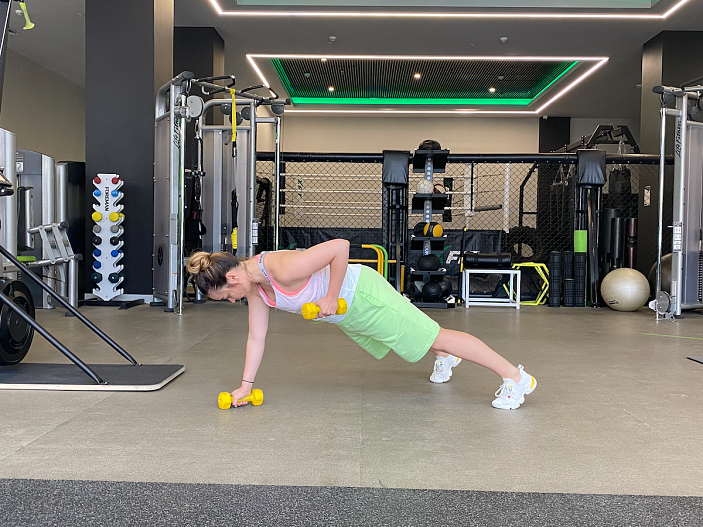 Исходное положение: планка, опора на гантели. Сохраняя положение планка, подтяните руку к животу, верните в исходное положение (опционально для мужчин и подготовленных сделайте отжимание) и выполните тягу к животу другой рукой.