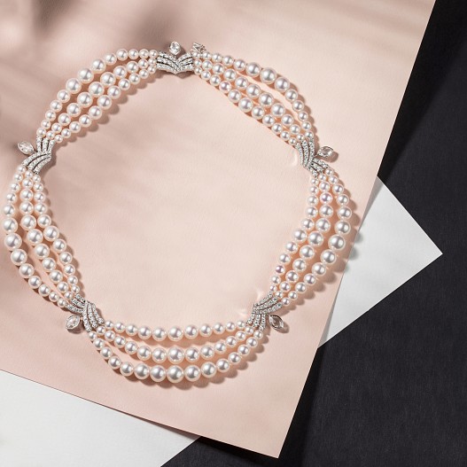 Новое колье выполнено из белого золота и культивированного жемчуга акойя.