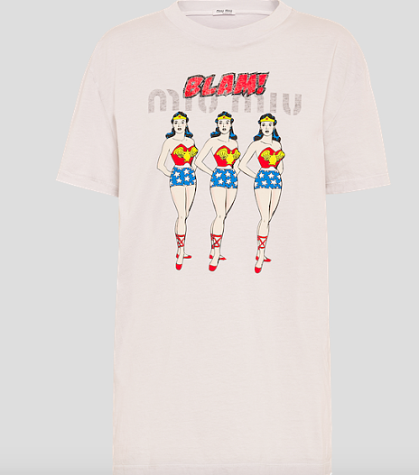 Кто бы усомнился, что речь идет о женщине! поддержать свой статус супервумен предлагаем с помощью капсульной коллекции футболок с легендарным персонажем wonder women. Предмет бесчисленных переосмыслений, как в комиксах, так и на экране, чудо-женщина теперь нашла новое проявление — в трех футболках miu miu wonder woman. Три сюжета: чудо-женщина в классической позе супергероя, в стиле пин-ап и борющаяся с динозавром. Приобрести футболки можно в избранных бутиках по миру, в том числе и в Столешниковом переулке.