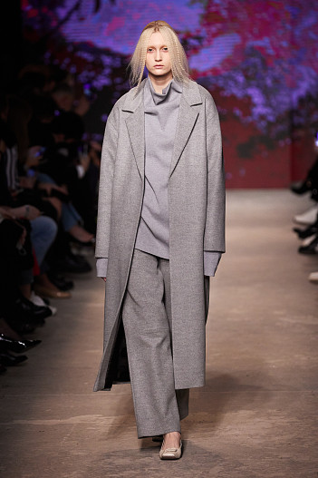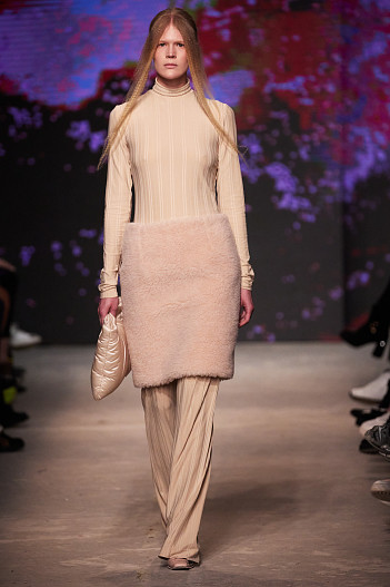 Трикотажные вариации, костюмы свободного кроя, «голые» (прозрачные) комбинации, буквально повторяющие каждый изгиб тела моделей, и юбки миди-длины, не сковывающие движения, идеально вписались в концепцию новой женственности от OTOCYON. Не обошлось без отсылки к домашнему стилю: меховые сумочки и «дутые» джемперы заняли свое место в череде образов.