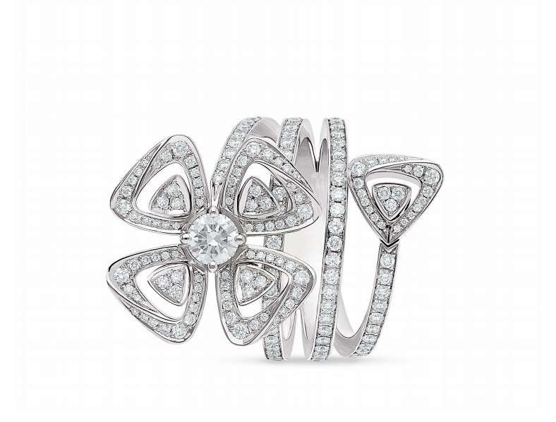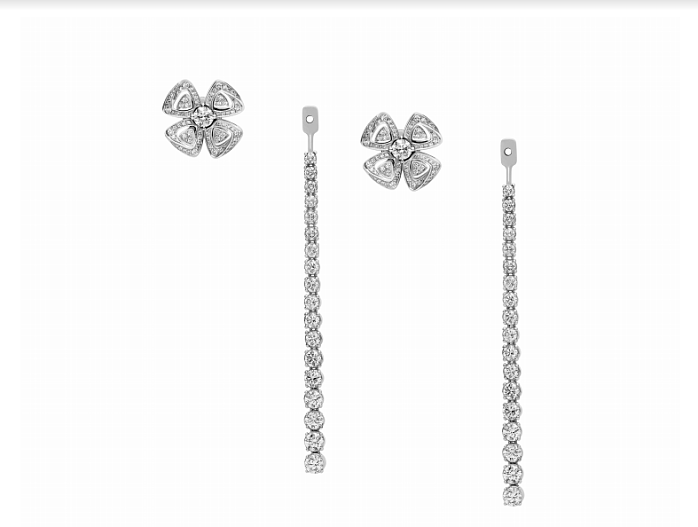 Женственные серьги из белого золота с однорядными бриллиантовыми каскадами, ниспадающими от знакового цветочного узора, при отсоединении подвесных элементов обращаются в универсальные серьги-гвоздики с четырьмя лепестками. Стремление к созданию трансформируемых украшений заложено в ювелирной ДНК Bvlgari, и сегодня оно находит новое воплощение.