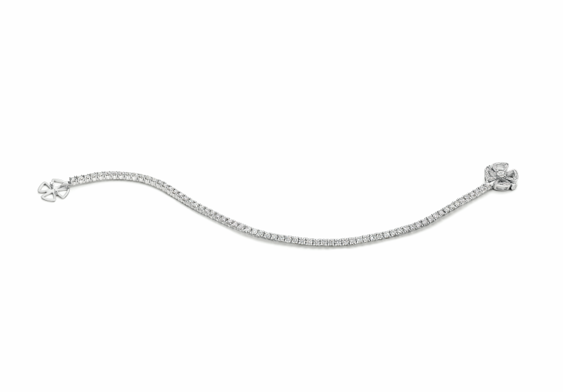 Завершает парюру браслет из белого золота и бриллиантов. Чтобы носить его было легко и комфортно придумана специально новая практичная застежка, исчезающая в лучистом одиночном цветке, венчающем творение. В универсальном ювелирном сете обыгрывается непреходящий стиль теннисного бриллиантового браслета в изысканном сочетании с прелестью цветочного мотива.