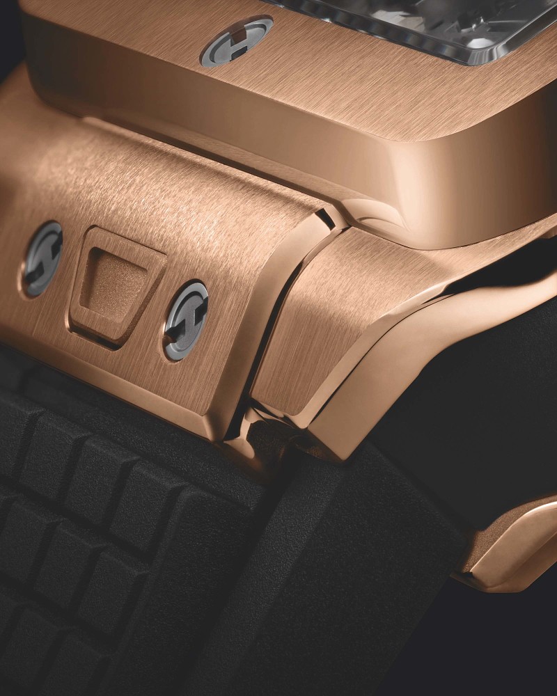 Кроме того, на безеле выделяются те же самые шесть (функциональных) винтов, размещенных точно таким же образом, как и в часах Big Bang. Боковую сторону корпуса Square Bang Unico продолжают такие же ушки, как и у моделей Big Bang, которые визуально уравновешивают дизайн и при этом защищают корпус. Что касается каучукового ремешка, то, помимо высоко оцененной системы One Click, применяемой в часах Big Bang, и фактурного декора в его средней части закреплены два винта. Наконец, в моделях Square Bang Unico используются те же материалы, что и в часах Big Bang – титан, керамика и золото King, – равно как и знаменитое оформление All Black.