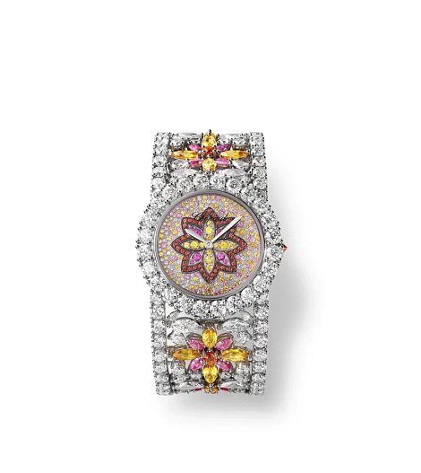 Драгоценные камни освещают усеянный блестками темно-синий циферблат из авантюрина, напоминающий ночное небо, на котором распустился перламутровый мозаичный лотос. Изгибы его лепестков образуют ореол вокруг второго цветка, усыпанного бриллиантами. На месте его пестика кружится парящий турбийон с четырьмя лепестками, также похожий на цветок. Он придает бесконечно поэтичную ауру работе этого миниатюрного механизма.