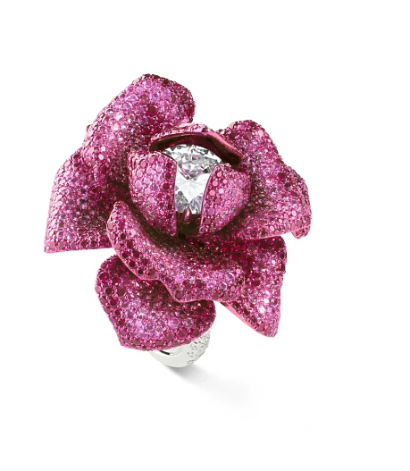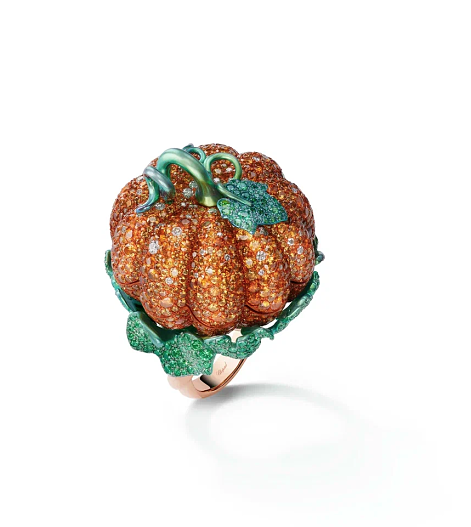 Ювелирный бал открывает кольцо Citrouille («Тыква»), словно вышедшее из многократно интерпретированной на киноэкране сказки «Золушка». Тыква из гранатов-спессартинов и цаворитов хранит в себе секрет: открыв ее, можно увидеть изготовленный из бриллиантов легендарный башмачок, благодаря которому прекрасный принц нашел свою суженую. Второе кольцо выполнено в форме розы с изящными лепестками из титана и алюминия, усыпанными розовыми сапфирами. В сердцевине цветка сверкает драгоценный бриллиант весом два карата: пусть он не может похвастаться нежным благоуханием, но его изысканная прелесть ласкает взор тех, кому посчастливилось увидеть это украшение, достойное самых романтических сценариев.