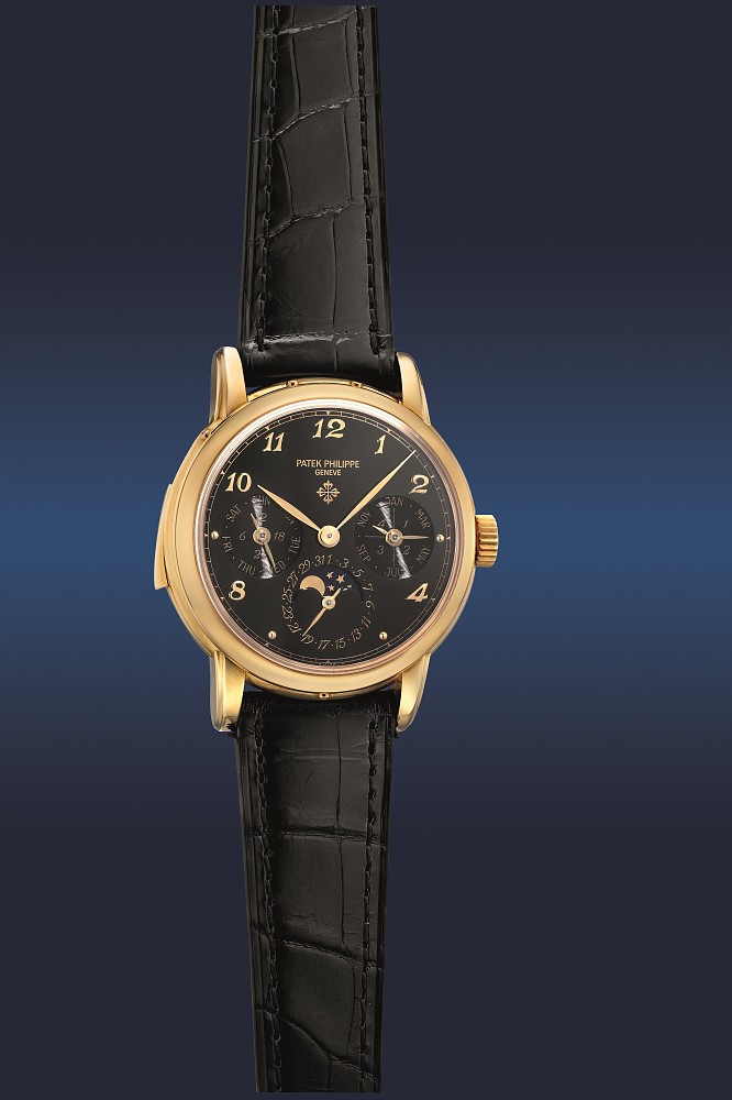 Часы Patek Philippe Ref. 3974 в корпусе из желтого золота с минутным репетиром, вечным календарем и индикатором фазы Луны (ок. 1990 г.). Проданы за HK$ 19,610,000 (US$ 2,498,314). Мировой рекорд для данной модели.