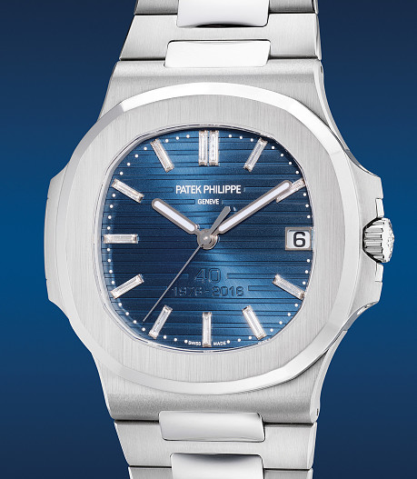 Часы Patek Philippe Ref. 5711/1P-001 в платиновом корпусе с бриллиантовыми метками. Один из 700 экземпляров, выпущенных к 40-летию модели Nautilus (ок. 2017 г.). Проданы за HK$ 4,032,000 (US$ 513,677).