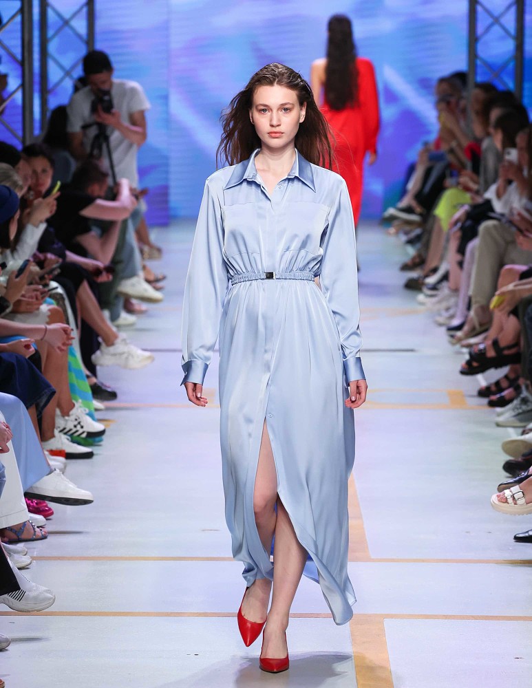 В работе над новой коллекцией бренд Industry продолжил исследовать современное видение женственности. Лейтмотивом стала эстетика природы. Прямые линии и глянцевая текстура шелка длинных платьев олицетворяли стихию воды, мощную и одновременно спокойную. Флористические принты и ключевой красный цвет вторили идеям гармонии и в то же время яркой индивидуальности. Модели воплотили естественную женскую красоту, которая выражалась в свободе проявления себя. Industry продемонстрировал комфортную одежду с женственными силуэтами: струящиеся юбки, универсальные и практичные платья-рубашки с акцентами на талии, а контрастные отстрочки, принты и комбинации цвета послужили лаконичным декором.
