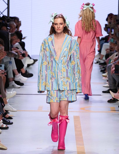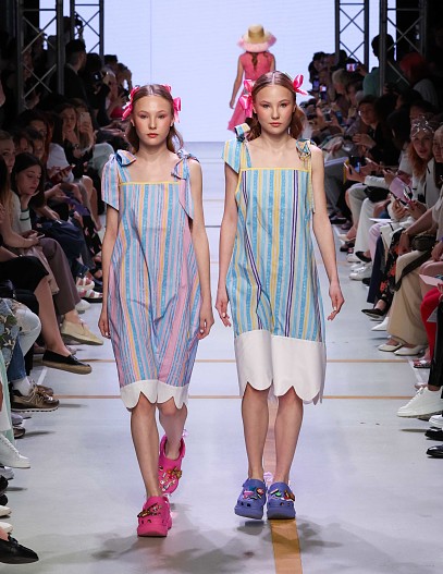 Жизнерадостная коллекция бренда Osipova Dasha пестрела сочными цветами и слегка инфантильными принтами. Открывала показ модель в салатовом платье А-образного кроя с крупными сердцами, а закрывала шоу модель в темно-синем платье с мультипликационными пчелами. Легкости и невесомости добавляли аксессуары: соломенные шляпы канотье и дутые салатовые сумки. Полосатые сарафаны с контрастным белым краем сменялись платьями с отложными воротничками. Яркие сочетания, некоторая наивность стали главной идеей показа бренда в этом сезоне Московской недели моды.