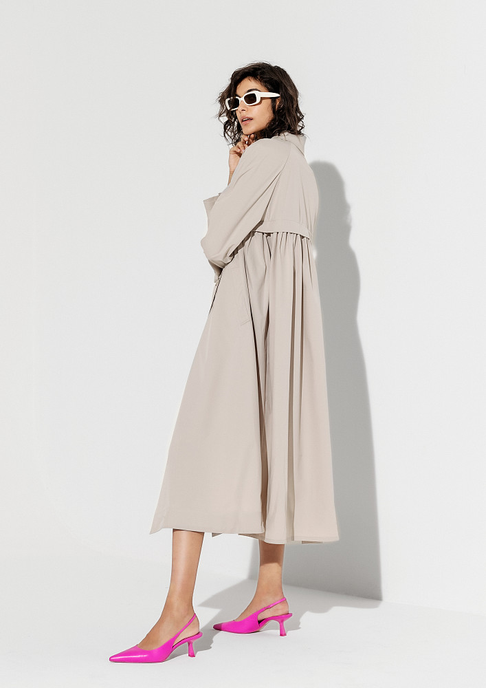 Вторая — изысканный и элегантный тренч из ткани би-стрейч в темно-синем цвете, который подойдет для любого случая.