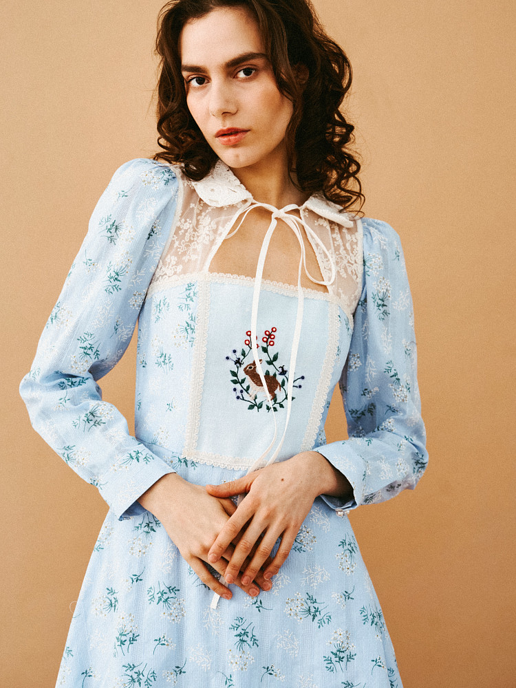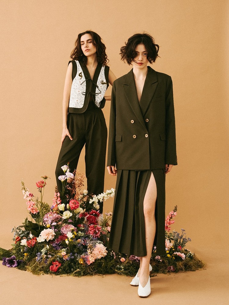 И это определенно удалось. В дропе по обыкновению представлены разнообразные модели: платья мини и миди, корсетные топы и летящие блузы, джинсы с кокетливыми кружевными вставками и силуэтные костюмы, аутентичные жилеты и расслабленные пижамные комплекты. Ткани украшены россыпью весенних цветочных и ягодных принтов, а также нежной пасхальной вышивкой. В образах присутствует русское кружево и изысканные прозрачные вставки, а в крое — визитная карточка бренда — рукава буф, воротники Питер Пэн, элегантные вырезы на спине, свободные и, напротив, женственные приталенные силуэты.