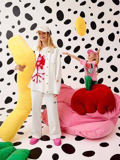 Лимитированная коллекция sela x Маша Сомик состоит из женской и детской линейки. Нежные, трогательные и наивные рисунки украсили уютные оверсайз футболки, эффектный джинсовый костюм в молочном оттенке, платья с рукавами-буфами, бейсболки, носки и даже стали переводными татуировками. Особое очарование коллекции добавляют милые надписи авторства Маши Сомик: «Я очень нежный цветочек», «Сегодня самый лучший день», «Ты — чудо».