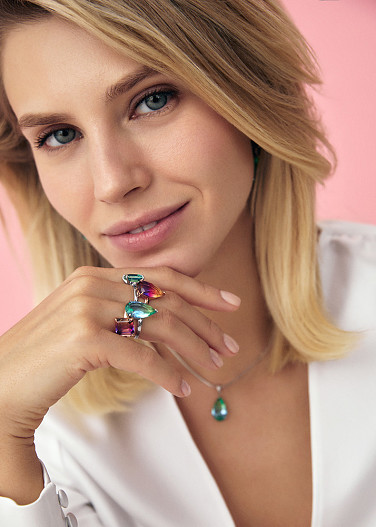 Среди новинок — трендовые серьги-кисти, динамичные серьги-цепочки, модные конго со съёмными деталями, лаконичные пусеты, серьги-каффы, элегантные колье с популярными символами, украшения в геометрическом стиле.